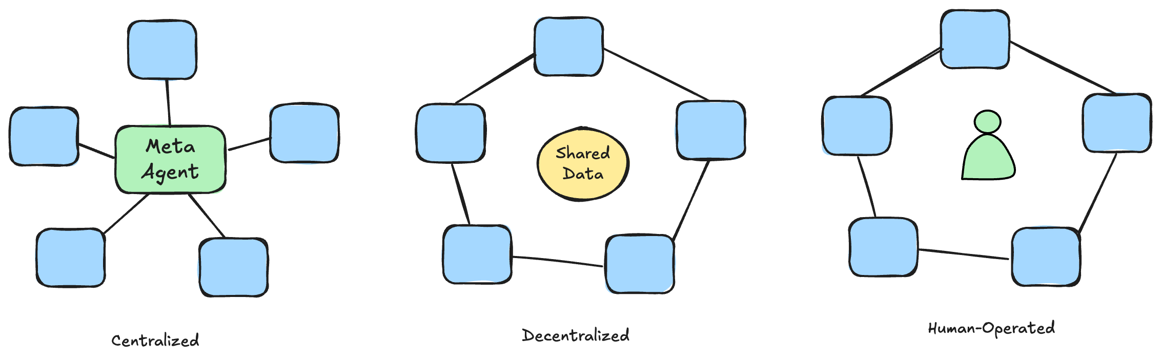 For complex goals multiple agents need to collaborate, in this setup agents need to shares the context for effective collaboration. This set up can be centralised, decentralised or human-operated.