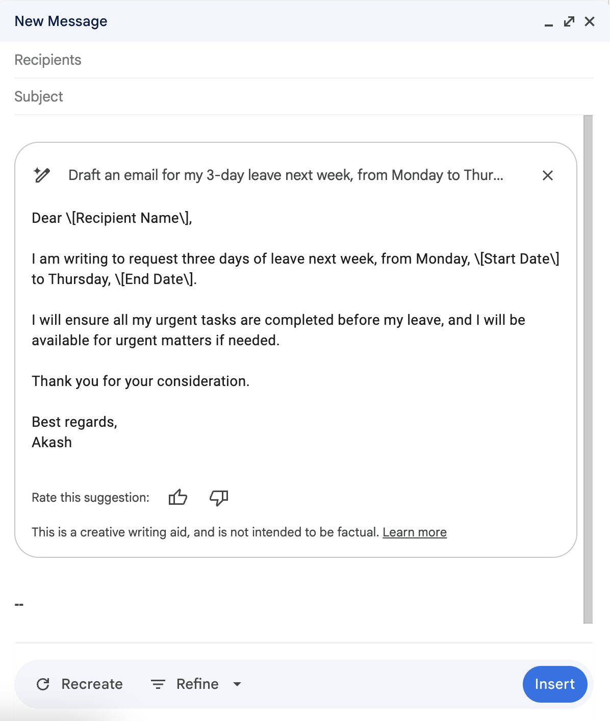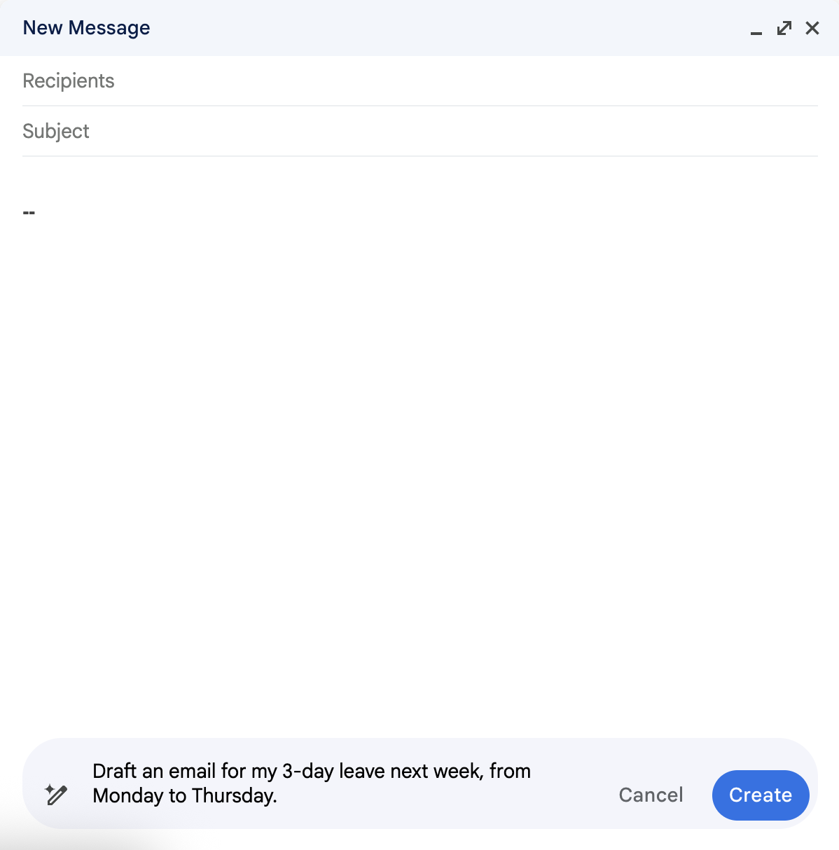 You no longer need to draft an entire email yourself—simply write a prompt like: "Draft an email for my 3-day leave next week, from Monday to Thursday." (The prompt doesn’t even need to be grammatically correct!)