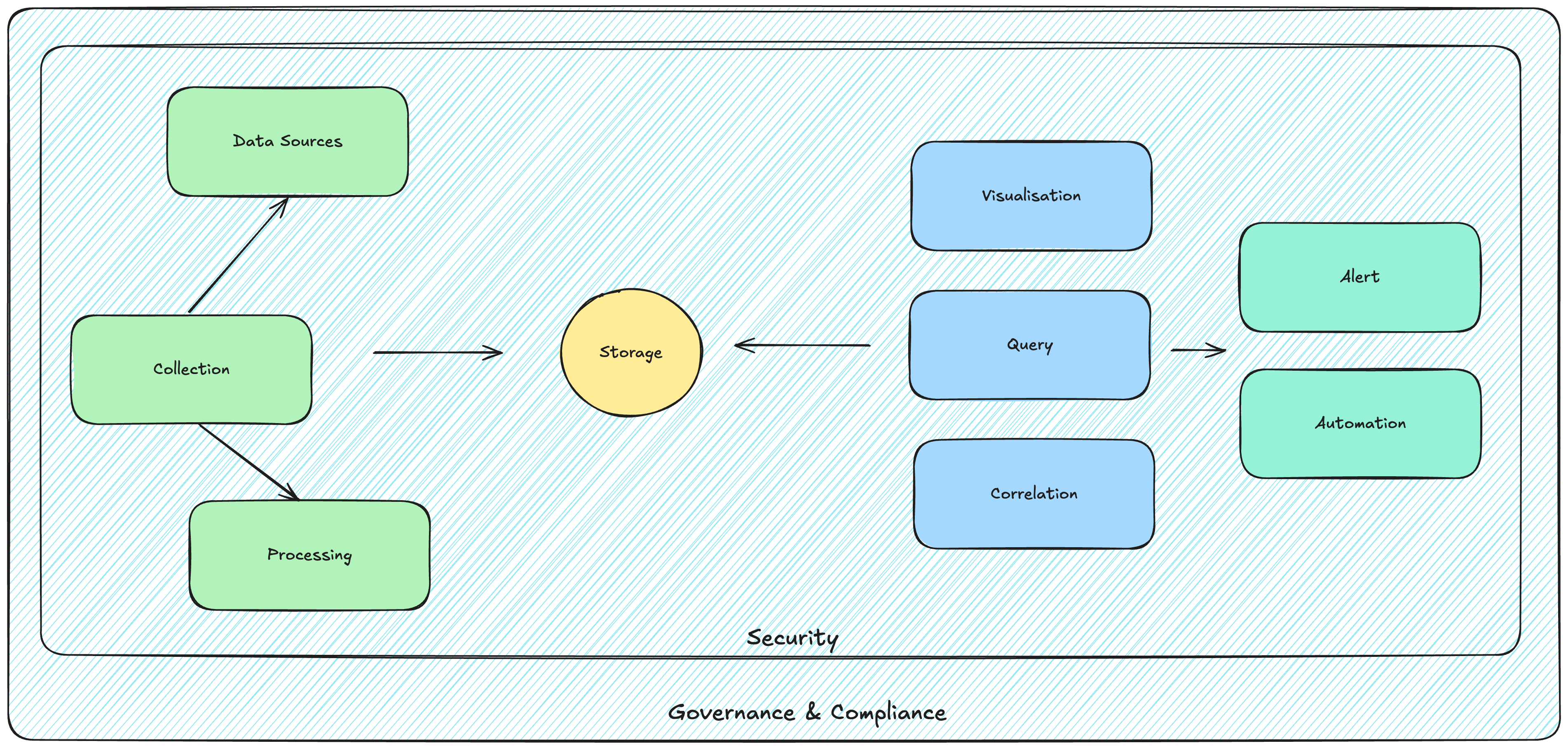 Processing : This can be a data pipeline to clean, filter, enrich, and transfortm the data into a processable format. Examples: Kafka, Datadog Processor